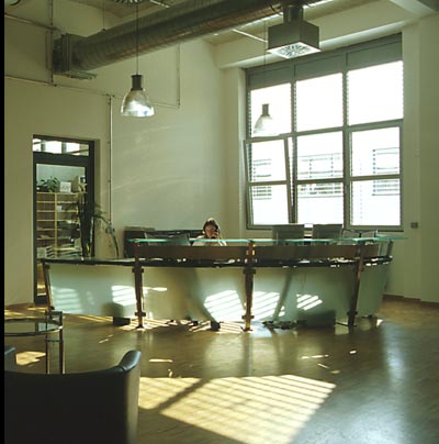 Entree´eines modernen Dienstleistungs- unternehems, transparent, großzügig, reduziert und funktional. Ausführungsplanung eines Empfangstresens nach Entwürfen der Innenarchitektin Natascha Götz, Frankfurt.
